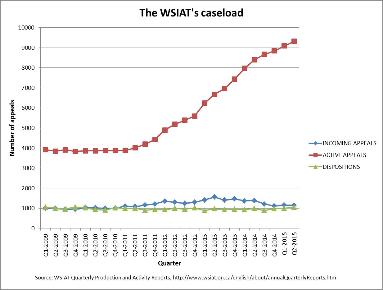 Starting in 2011, the number of active cases began increasing, quarter upon quarter, in a remarkably swift and steady fashion. By the end of the second quarter of 2015, the number of active appeals had increased to 9,314—i.e. significantly more than double the number the WSIAT has the capacity to deal with.