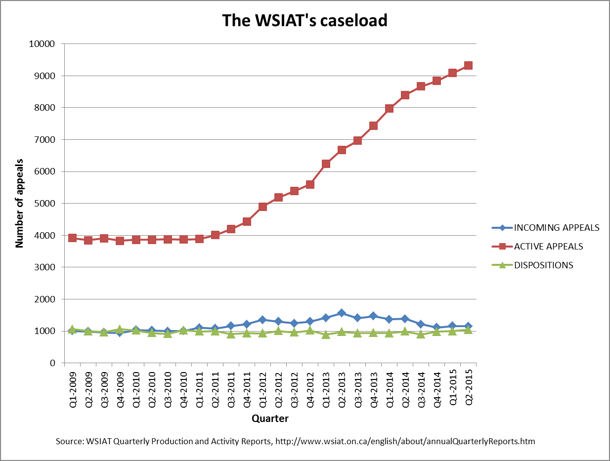 In my view, a systemic investigation is warranted, and immediately too. As I’ll explain using the WSIAT’s own data, the current situation—in which the level of delay goes far beyond what is tolerable in any reasonable administrative justice system—is the result of a backlog of appeals that has been steadily increasing for the last four years and, despite the WSIAT’s rather extraordinary public pleas for help (in 2013, 2014 and 2015), there has been no effective response from the government.